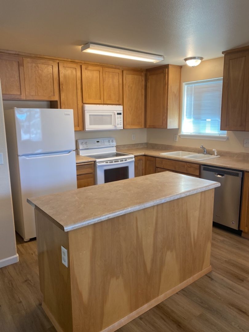 The home features a functional layout with laminate flooring and carpet throughout. The kitchen is equipped with a range, refrigerator, and dishwasher, and the unit also includes a stackable washer and dryer for added convenience. With just over 1,100 square feet of living space, this home offers comfortable and practical living.
